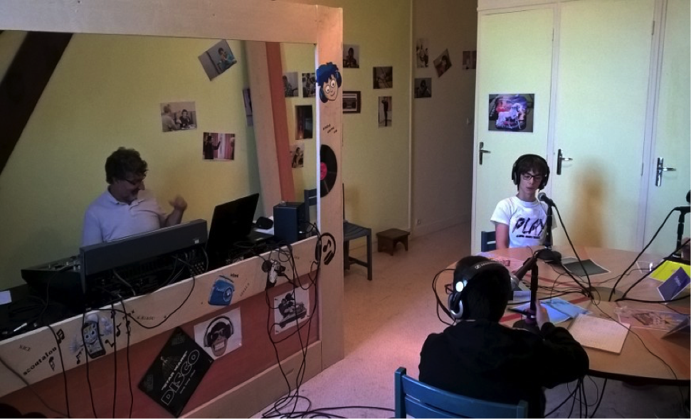 Grâce à la participation des jeunes de l’atelier menuiserie et dans l’objectif de créer des conditions similaires à celles d’un studio son, nous avons aménagé, dans une pièce dédiée de l’IMPro, une véritable radio comprenant un espace studio avec micro et un espace régie avec console.